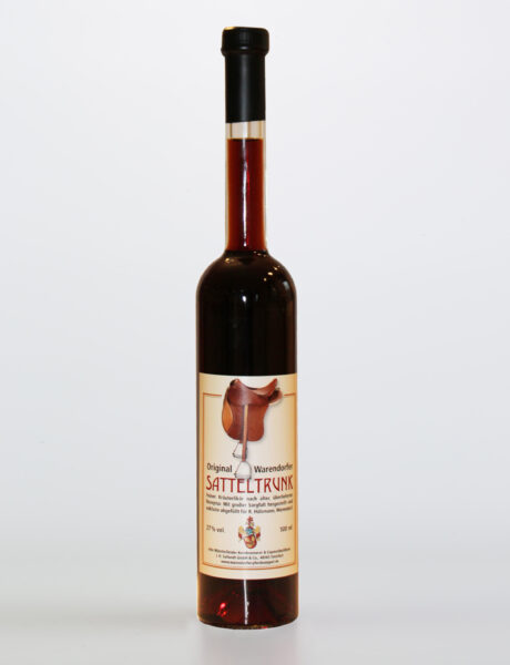 Original Warendorfer Satteltrunk, ein feiner Kräuterlikör nach alter, überlieferter Rezeptur. Mit großer Sorgfalt hergestellt und exklusiv abgefüllt für R. Hülsmann, Warendorf.