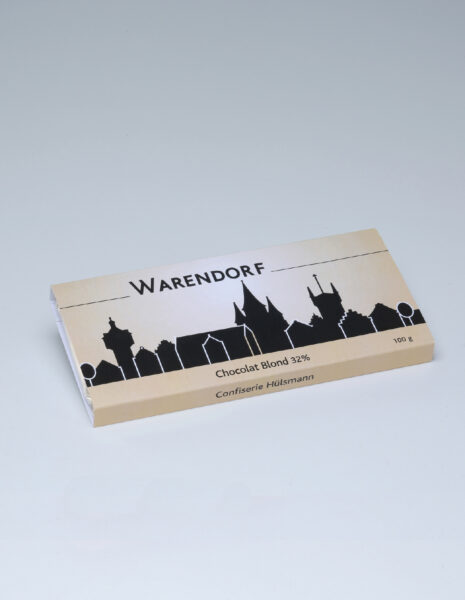 Blonde Schokolade (mindestens 32% reine Kakaobutter), Zutaten: Kakaobutter, Zucker, Vollmilchpulver, Emulgator: Sojalecithin, Molke, Butter, natürliches Vanilleextrakt.